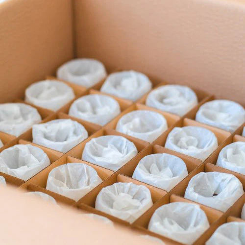 On an individual product level for our customers, there is no waste packaging or excess plastic rubbish as each cup is only wrapped in tissue paper then placed either into cardboard boxes or their own long-term dust-proof drawstring storage bags. Plus our entire range of cups are marked as 100% recyclable as a PP7 category material and can be put through your local recycling centre.
